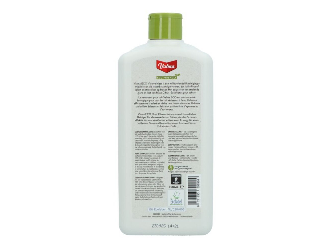 Valma ECO vloerreiniger is een geconcentreerde ecologische dagelijkse neutrale vloerreiniger geschikt voor alle waterbestendige vloeren. De speciale actieve bestanddelen zorgen dat het vuil makkelijk losweekt en oplost voor optimale reiniging. Voeg 12,5 ml toe aan 5 liter water bij lichte verontreiniging, of 25 ml bij sterke verontreiniging. Valma ECO vloerreiniger droogt streeploos op, geeft een stralende glans en laat een frisse Citrus en Eucalyptus geur achter. Alle Valma ECO reinigers zijn een uitstekend milieuvriendelijk alternatief ten opzichte van conventionele schoonmaak producten.
