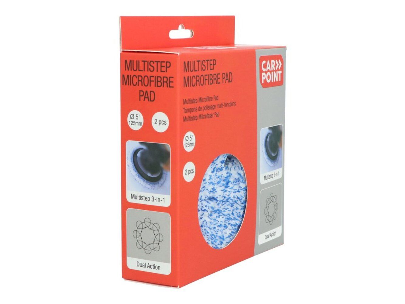 Set met twee Carpoint Multistep Micovezel Pads met een diameter van 125mm (5”) om de lak te behandelen. De Multistep Microfibre Pad is multifunctioneel en geschikt voor voor het verwijderen van krassen en lakverweringen, polijsten van lak, verwijderen van swirls of het aanbrengen van wax. Gebruik de pads in combinatie met een poets- of dual action polijstmachine. Laat de machine het werk doen, oefen geen extra druk uit. Te veel druk zorgt er voor dat de machine langzamer gaat werken en heeft een negatief effect op de kwaliteit van het werk. De polish pads zijn van gemaakt zijn van hoogwaardig foam, het gat in de pad zorgt ervoor om de warmte tijdens het polijsten af te voeren. Na gebruik de pads handmatig reinigen met een mild reinigingsmiddel (<60°C). Gebruik voor het reinigen geen oplosmiddelen of alkalische reinigers. Daarna laten drogen op een handdoek met het oppervlakte naar beneden.