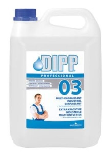 Te verdunnen met water in de verhouding 1/2 tot 1/40. Voor hardnekkige vervuilingen is het aangeraden om het product de eerste maal sterk geconcentreerd te gebruiken. Oplossing enkele minuten laten inwerken, reinigen met een spons en daarna goed spoelen met water. DIPP N°03 werkt nog efficiënter met warm water en op warme oppervlakken (50-70°).