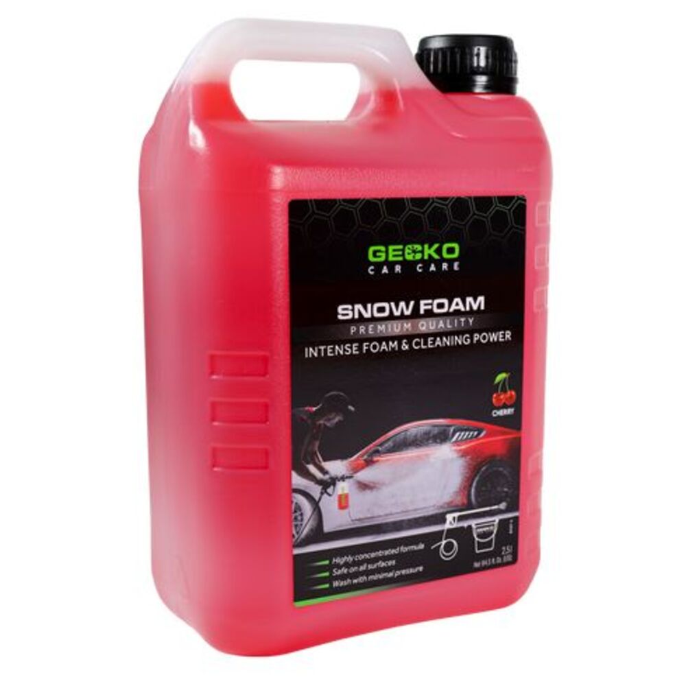 Gecko Snow Foam, een krachtige hoogschuimende shampoo, biedt een doeltreffende oplossing voor het verwijderen van hardnekkig vuil van uw voertuig. Dit schuim heeft een diepgaande reinigende werking, zonder schade toe te brengen aan de lak of bestaande waxlagen. Maak gebruik van Gecko Snow Foam in combinatie met een hogedrukreiniger en de Gecko foam gun voor optimale resultaten. Dit product garandeert niet alleen een grondige reiniging, maar ook een streeploos en glanzend eindresultaat. Bovendien heeft Gecko Snow Foam een verfrissende kersengeur, waardoor het reinigen van uw voertuig een aangename ervaring wordt.