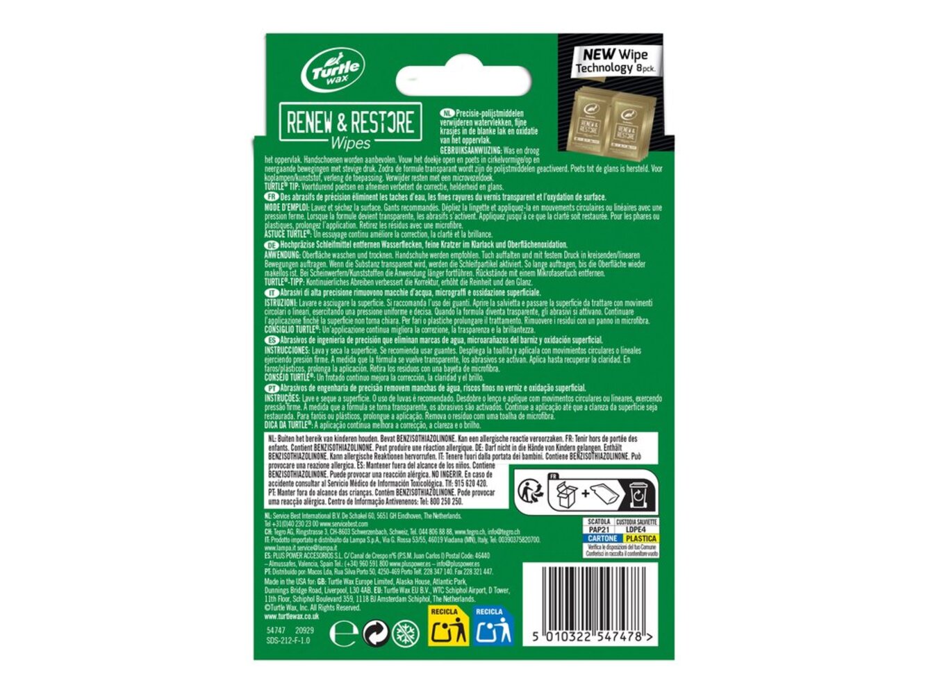 Turtle Wax Renew & Restore Wipes zijn de ultieme oplossing om de oppervlakken van het voertuig nieuw leven in te blazen. Doordrenkt met uniek samengestelde precisieschuurmiddelen zijn deze krachtige doekjes ontworpen om veilig oxidatie, lakoverdracht, watervlekken, insecten en straatvuil te verwijderen van lak, glas, koplampen en meer. Of het nu gaat om hardnekkige watervlekken op ramen of verbleekte koplampen, deze doekjes leveren uitzonderlijke resultaten zonder agressieve chemicaliën of ingewikkelde gereedschappen. Veelzijdig en eenvoudig in gebruik bieden Renew & Restore Wipes een complete oplossing om het voertuig er op zijn best uit te laten zien. De zachte maar effectieve formule herstelt helderheid en glans. Handig verpakt voor gebruik onderweg, zijn deze doekjes perfect voor snelle retouches of grondige reinigingsbeurten, waardoor u tijd bespaart en telkens een gepolijste, professionele afwerking krijgt.