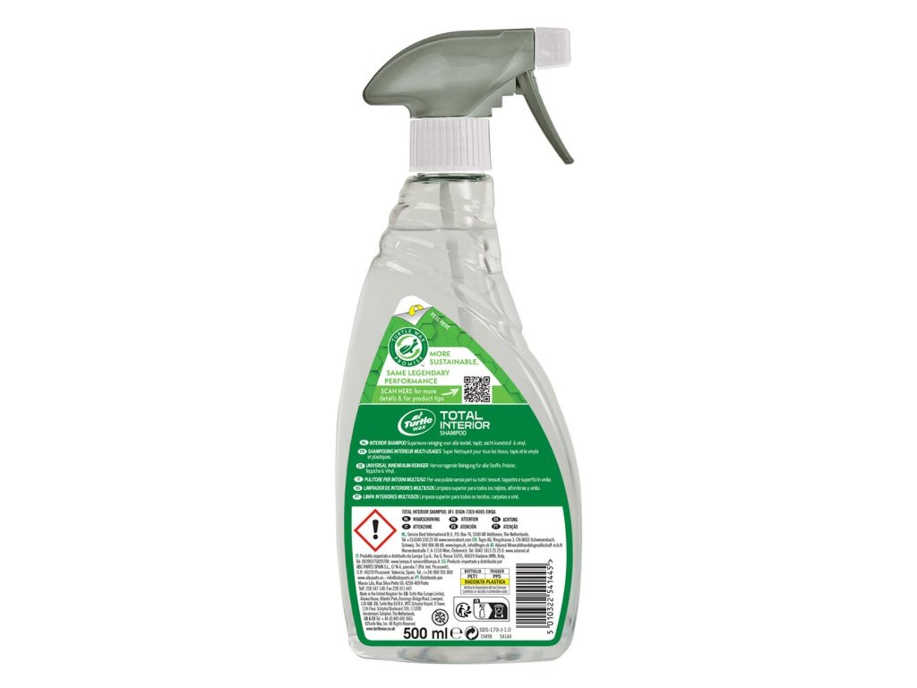 Turtle Wax Interior Shampoo is een alles-in-één interieurreiniger voor stoffen, tapijten en vinyl. Een geconcentreerde mix van reinigingsmiddelen en schoonmaakmiddelen pakt vlekken aan veroorzaakt door koffie, thee, frisdrank, chocolade en ijs. Geur neutraliserende ingrediënten verwijderen veel voorkomende autogeuren veroorzaakt door eten, drinken, huisdieren en roken, terwijl ze een frisse linnengeur achterlaten. De siliconenvrije formule zorgt er ook voor dat de afwerking niet vet is op alle kunststoffen, vinyl en zelfs technische schermen van moderne infotainmentsystemen in de auto.