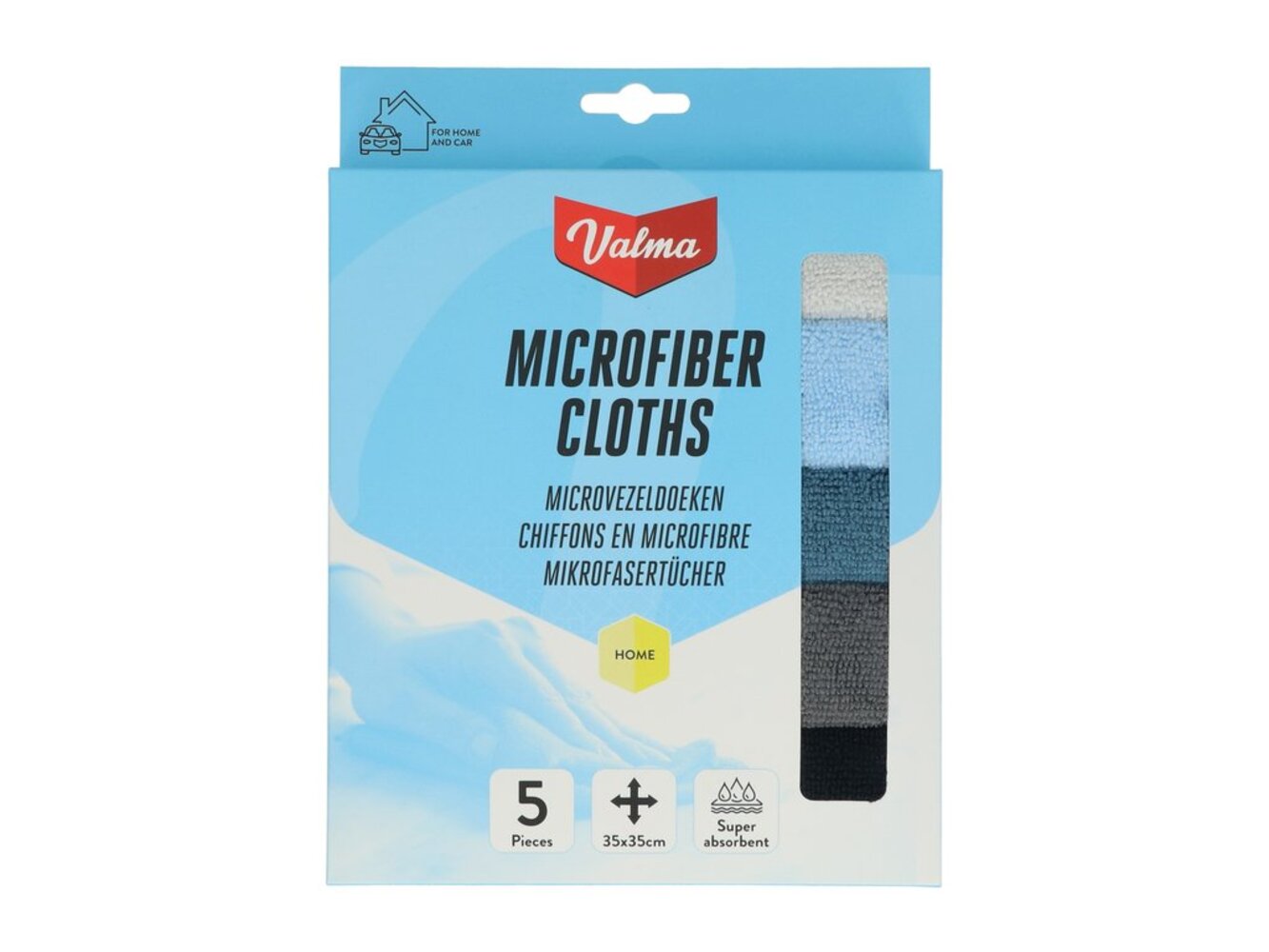 Deze set met vijf Valma microvezeldoeken zijn ontworpen voor vele uiteenlopende schoonmaakklussen en binnen- en buitenshuis te gebruiken. Door de innovatieve microvezelstructuur wordt vuil, stof en vet eenvoudig opgenomen en vastgehouden. Maakt grondig schoon, ook op kwetsbare oppervlakken zonder te krassen. De superzachte microvezeldoeken hebben een hoog absorberend vermogen van water en vuil en zijn zowel droog als nat te gebruiken. Reinigt en droogt in één enkele beweging met eventueel een kleine hoeveelheid water. De microvezeldoeken hebben een afmeting van circa 35x35cm en zijn perfect voor het reinigen van meubels, keukens, badkamers, auto’s en elektronische apparaten. Altijd handig om in huis te hebben voor iedere schoonmaakklus of bij je te hebben in de auto, camper, caravan.