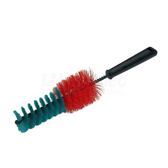 Lichtmetalen wielreinigingsborstel met gemiddelde stijfheid, synthetische filamenten, chemisch bestendig met nylon beschermd handvat Technische gegevens van de Vikan Velgenborstel Harde velgborstel gegalvaniseerd metaal en harde rood/groene polyester vezels vezellengte 40 mm max.